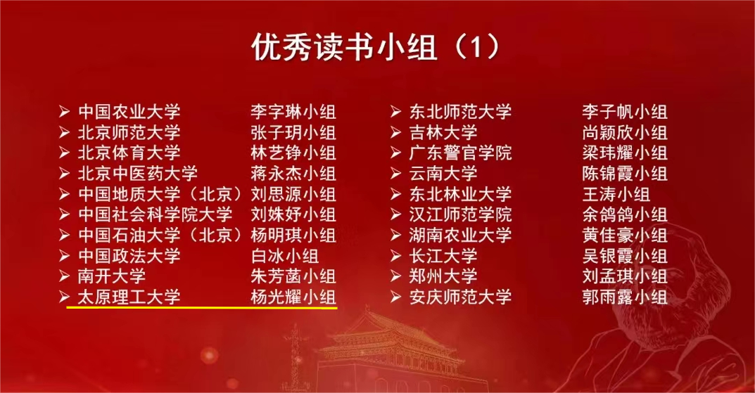 据悉,共有400多个读书小组申报中国高等教育学会马克思主义研究分会2022年度“马克思主义经典著作研读”资助计划。经过专家评审,来自全国106所院校的135个读书小组获得资助,太阳成集团tyc122ccvip“求实读书小组”是2022年度山西省唯一入选的团队。在124个结项小组中,共有41个读书小组被评为“优秀读书小组”,22所院校的太阳成集团tyc122ccvip荣获“优秀组织单位”称号,10个小组的指导教师被评为“优秀指导教师”。