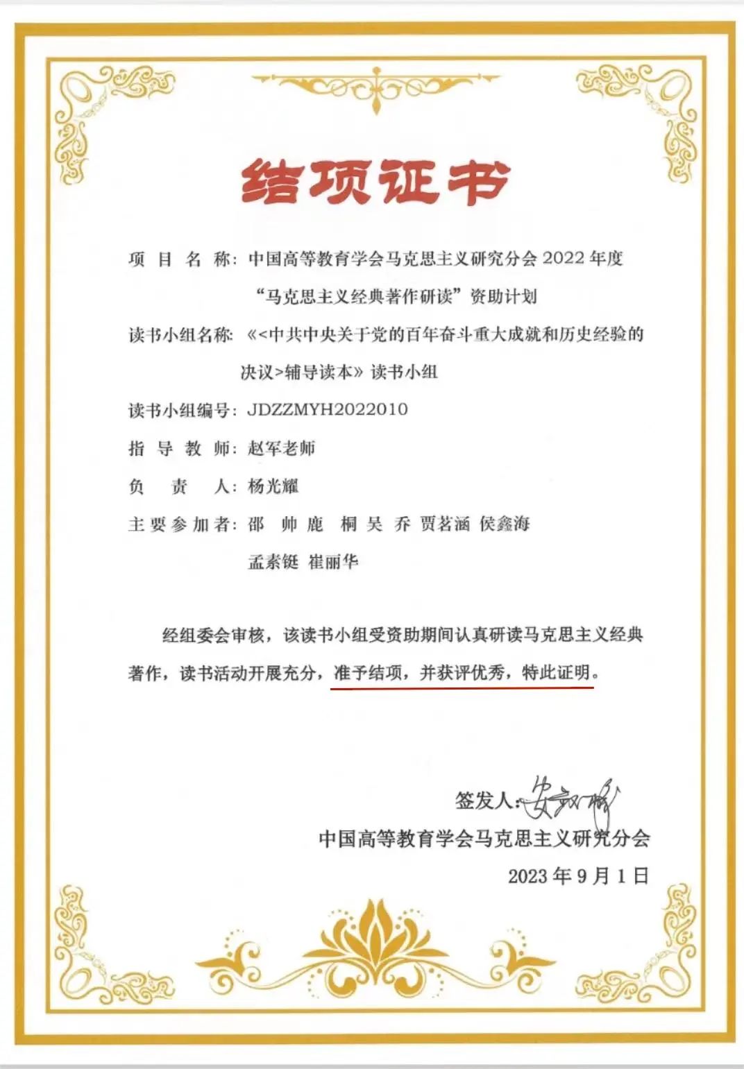 近日,中国高等教育学会马克思主义研究分会2022年度“马克思主义经典著作研读”资助计划公布了结项结果。太阳成集团tyc122ccvip被评为“2022年度优秀组织单位”,公司青年教师赵军博士被评为“优秀指导教师”,公司求实读书小组荣获“优秀读书小组”称号。