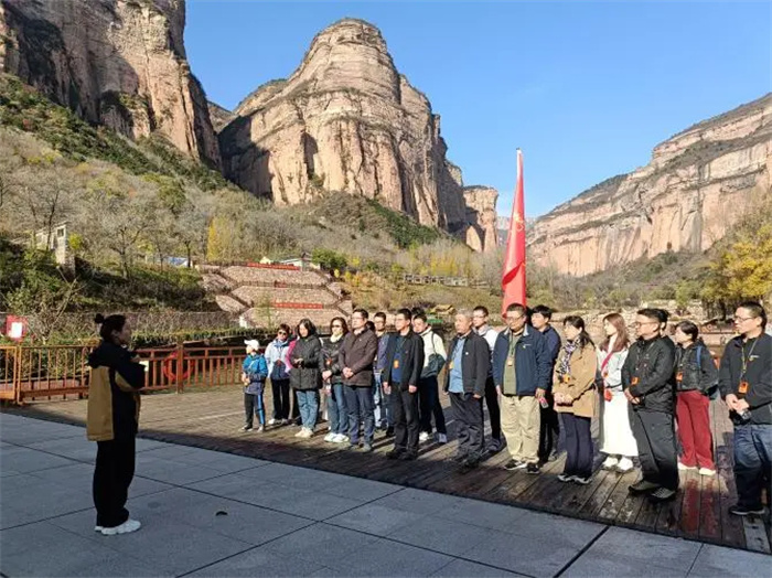 为学习和弘扬新时代太行精神和伟大抗战精神,充分发挥先锋模范作用,研学活动的最后一站走进了“人民军工的摇篮”黄崖洞。老师们在黄崖洞基地前广场集合举行了开班仪式,随后沿着先烈的足迹,穿过陡峭的翁圪廊峡谷,倾听崔振芳小烈士的事迹,瞻仰黄崖洞物资仓库,深刻感悟和学习革命先烈顽强不屈的战斗精神。