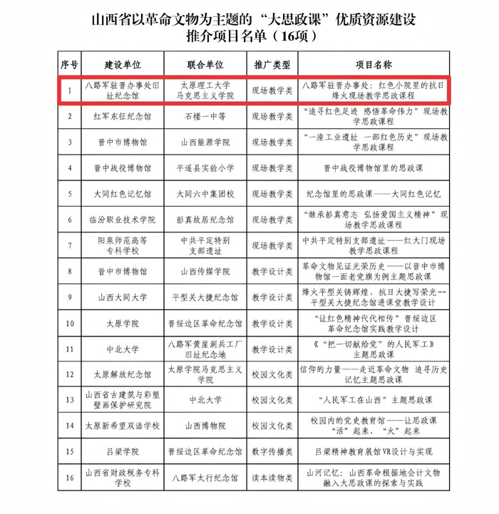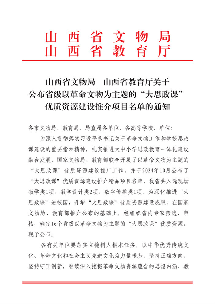 通知指出,为深入贯彻落实习近平总书记关于革命文物工作和公司思政课建设的重要指示精神,扎实推进大中小学思政教育一体化建设融合发展,深化推进“大思政课”进校园,升华“大思政课”优质资源建设成果,在国家文物局、教育部推介公布的基础上,经组织山西省内专家筛选、审核,确定了16个省级以革命文物为主题的“大思政课”优质资源。