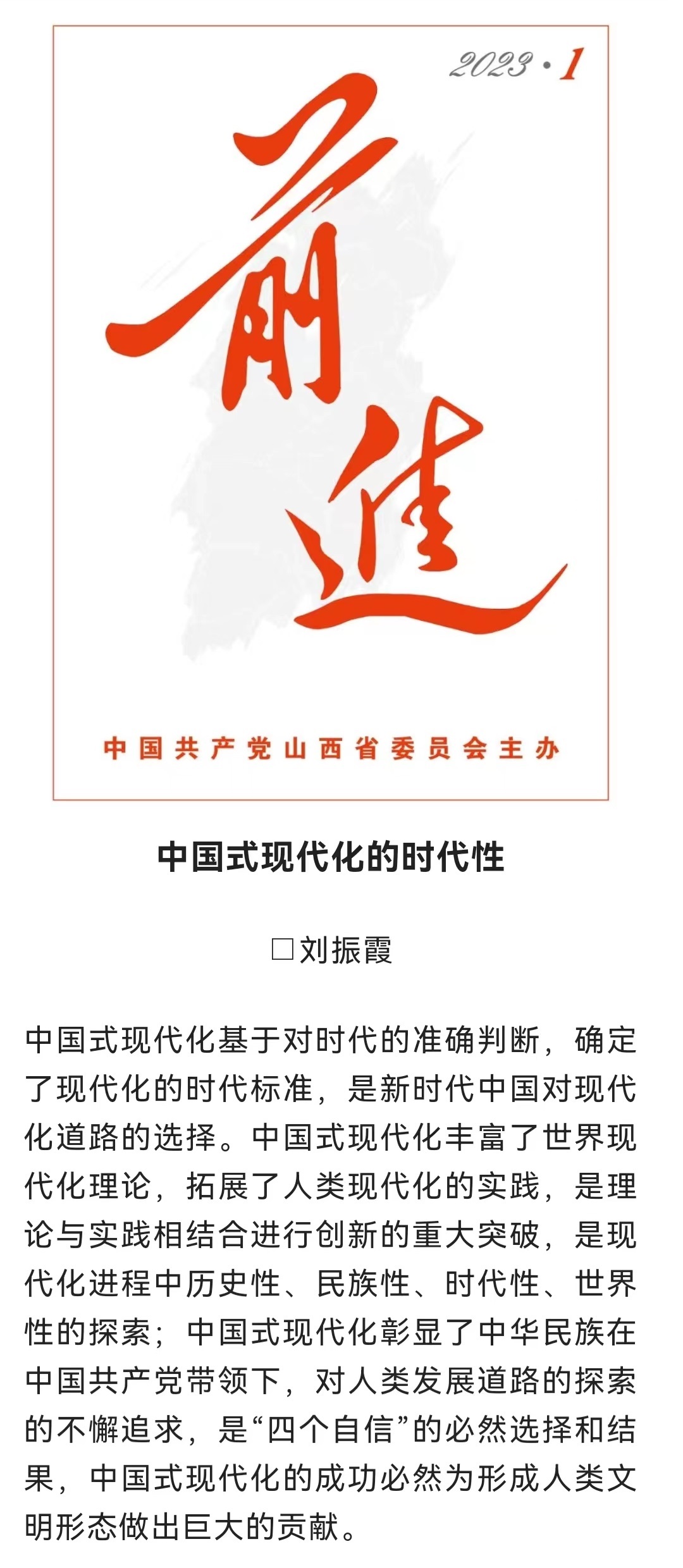 近日,《前进》2023年第1期刊发公司经理刘振霞署名文章《中国式现代化的时代性》,《前进》微信公众号在“前进论坛”栏目中进行了全文推送。