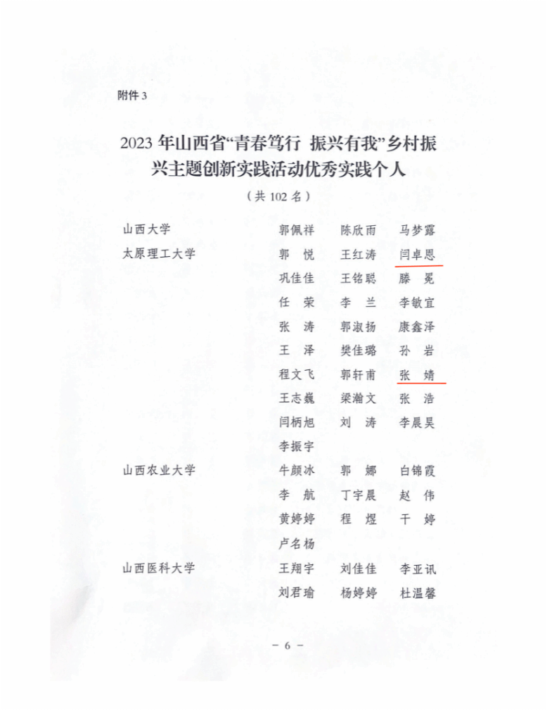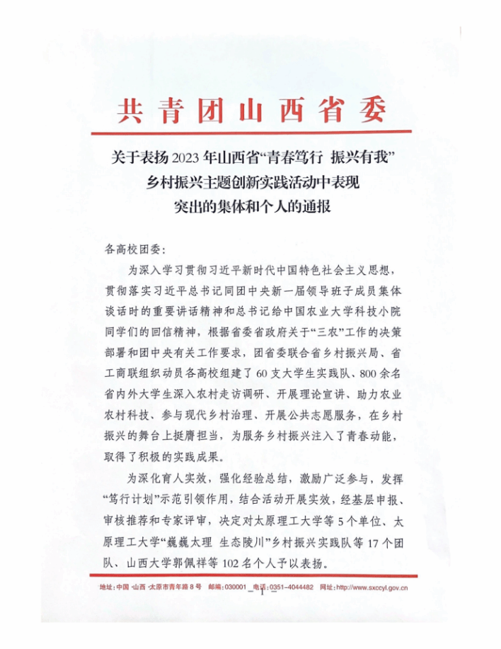 近日,共青团山西省委发布《关于表扬2023年山西省“青春笃行振兴有我”乡村振兴主题创新实践活动中表现突出的集体和个人的通报》,太阳成集团tyc122ccvip辅导员闫卓恩老师、思政2103班张婧同学荣获2023年山西省“青春笃行 振兴有我”乡村振兴主题创新实践活动优秀实践个人称号。