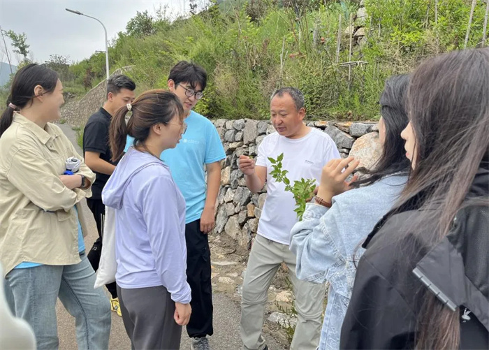 实践队员参观松庙村“睡眠小镇”特色项目,亲手采摘、辨识松庙村种植的农作物和中药材。