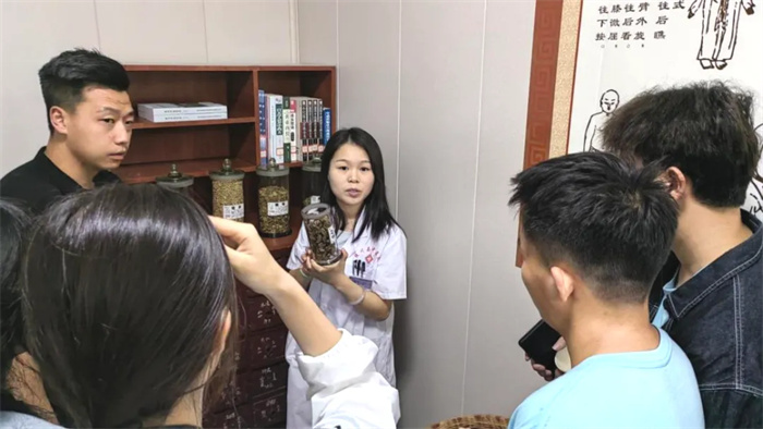 实践队员参观松庙村卫生室“怡养松吧”,体验推拿、艾灸等中医疗法。
