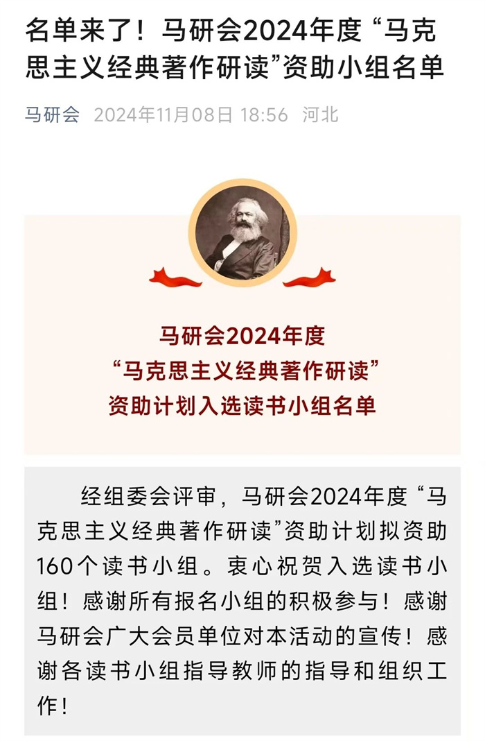 2024年11月8日,中国高等教育学会马克思主义研究分会(以下简称“马研会”)2024年度“马克思主义经典著作研读”资助计划名单公布。公司三个读书小组成功入选。这是公司连续三年入选马研会“马克思主义经典著作研读”资助计划。由前两年每年一个读书小组入选,发展为今年三个小组同时入选,实现了新的突破。