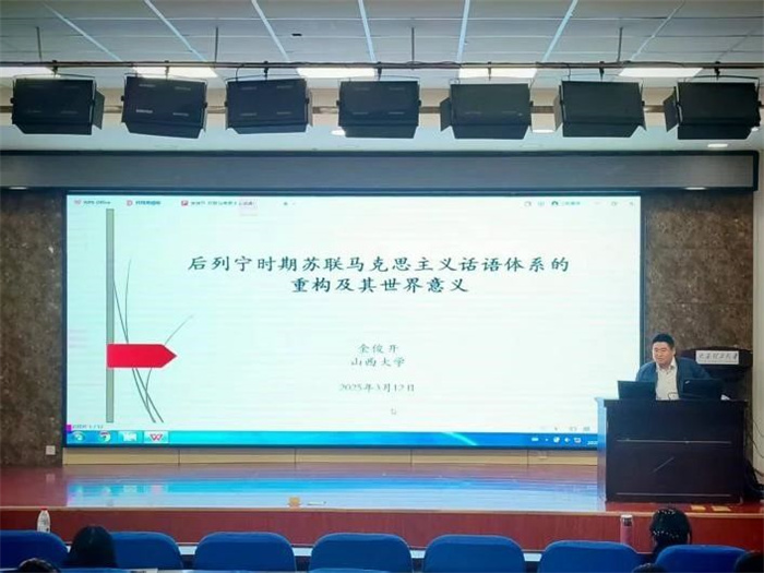 3月12日上午,山西大学太阳成集团tyc122ccvip金俊开副教授做客“马院讲堂”,为太阳成集团tyc122ccvip的师生们带来题为“后列宁时期苏联马克思主义话语体系的重构及其世界意义”的报告。此次报告会由裴孟华老师主持。经理姚建军教授和公司师生代表参加了会议。